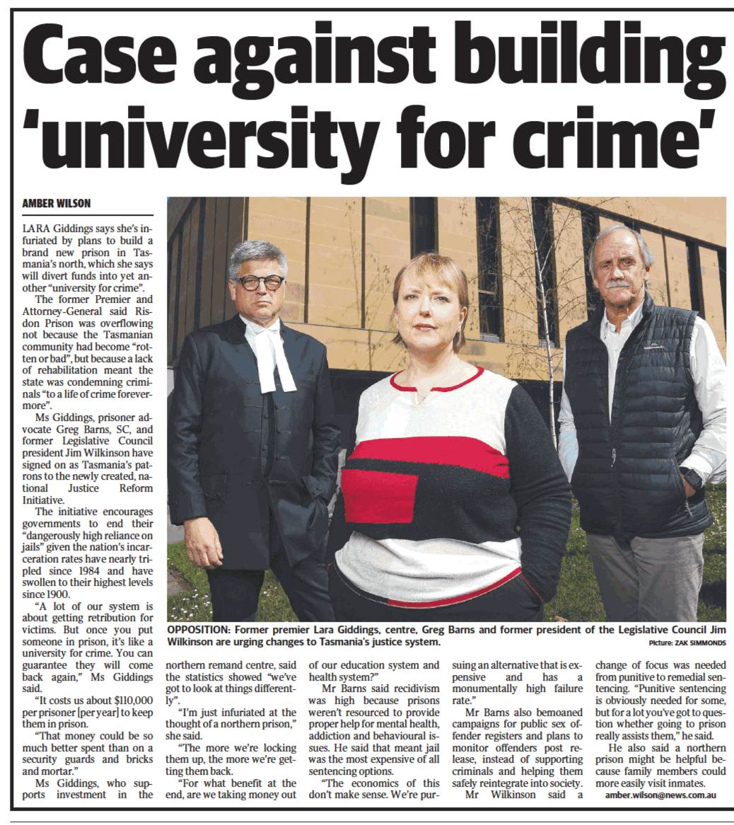 Ms Giddings, prisoner advocate Greg Barns SC and former Legislative Council president Jim Wilkinson have signed on as Tasmanians patrons to the newly created, national Justice Reform Initiative.